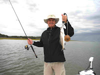 I got a 2nd trip in today with the Blalock fishing team, this time with William and his fishing partner Bryan and we met out at the Goffinsville Park as the sun came up. We headed over to Broward Island and fished the north end...but the tide was still going out so we headed to the south end and this did the trick. Bryan commented that we had good action right off - catching Seatrout, Redfish, and Flounder. We even had a big one on that was wiley enough to play "possum" until it got under the boat, then it made a dash for the bow, went around the trolling motor and, BAP! fish off! But we fished that area for a while and added another Redfish or two.We then came back around to Spanish Drop and fished some flooding oysters, first with jigs, then with float rigs and basically caught Ladyfish, the "poor man's tarpon".